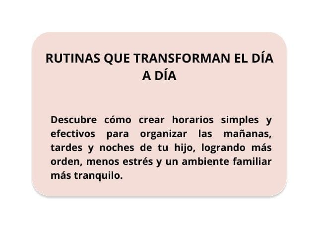 Rutinas que transforman el día a día – Descubre cómo crear horarios simples y efectivos para organizar las mañanas, tardes y noches de tu hijo, logrando más orden, menos estrés y un ambiente familiar más tranquilo. Valorado en $47