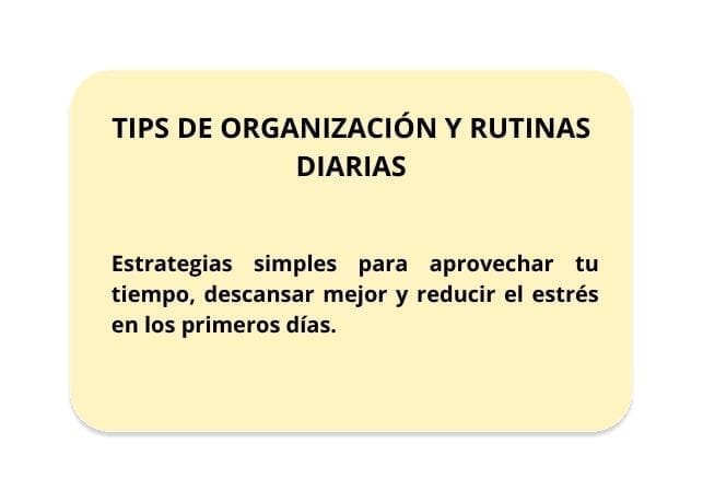 Tips de organización y rutinas diarias – Estrategias simples para aprovechar tu tiempo, descansar mejor y reducir el estrés en los primeros días. Valorado en $35